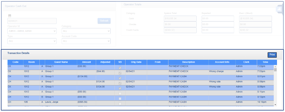 Yof el pago fue anulado, mostrará un X. Yof el pago es una transferencia desde otra habitación, la habitación original se mostrará en la columna Desde.