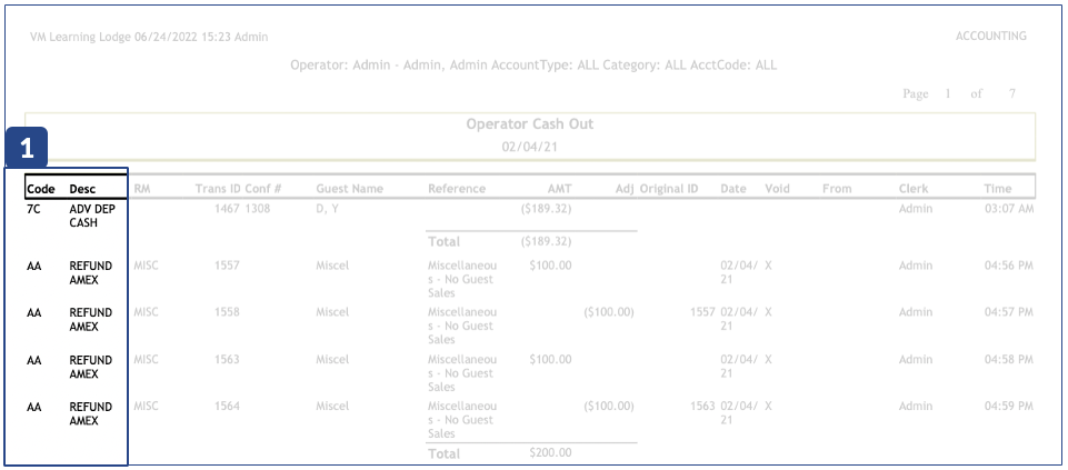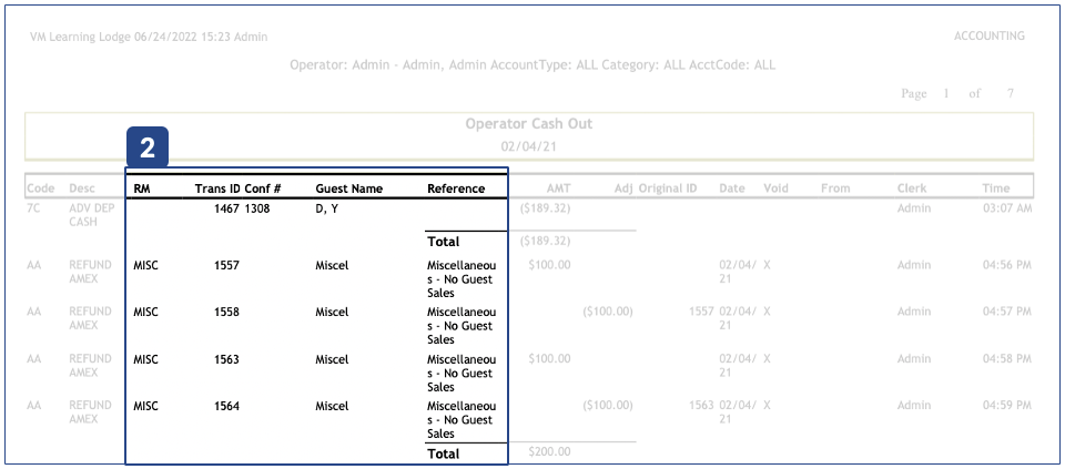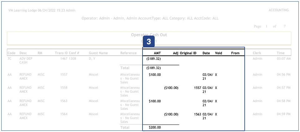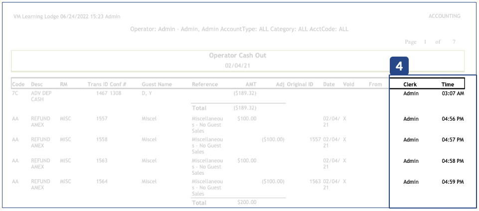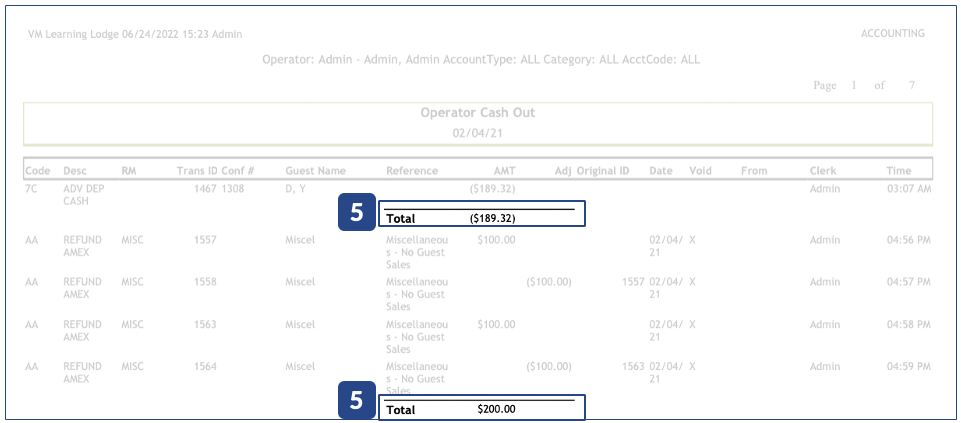 Cada usuario tiene que reportar su propio total separado al final de su cambio. La auditoría nocturna solo comprobará el total reportado por cada usuario eligiendo TODO en el ID de operador en la sección Out Out Cash Out del operador (1).