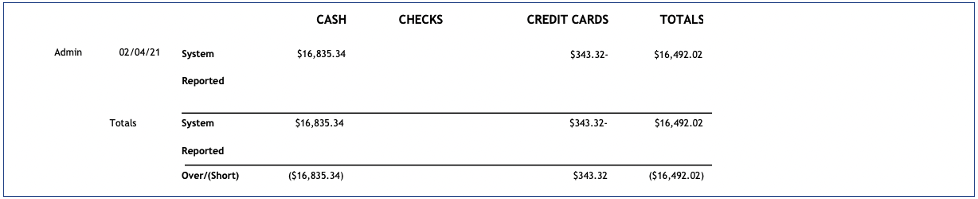 Esta última sección mostrará el total de todos los usuarios por categoría de pago (efectivo, cheques y crédito) reportados por el sistema e reportados por el usuario y el Grand Total.