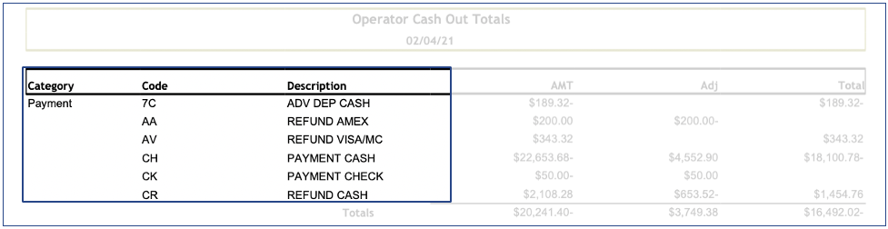 - La salida de efectivo del operador muestra los detalles de cada método de pago por código contable.