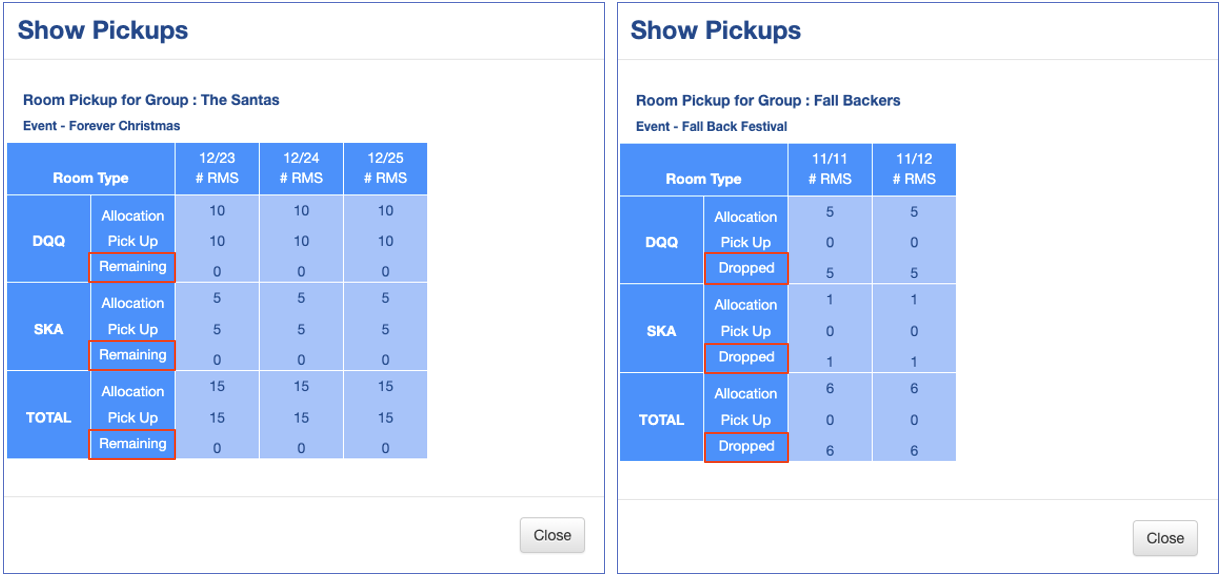 Recuperación grupal es un resumen que le indicará por tipo de habitación (y en total) y por fecha, cuántas habitaciones fueron asignadas, cuántas fueron recogidas y cuántas quedan o abandonadas, si se pasa la fecha de abandono.