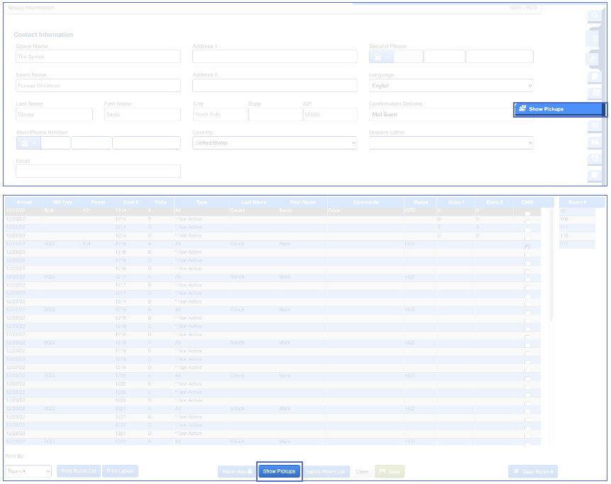 Camino2:Front Office > Grupo > Buscar > Abrir el grupo > Lista de habitaciones (en la caja de herramientas de la derecha) > Mostrar pastillas.