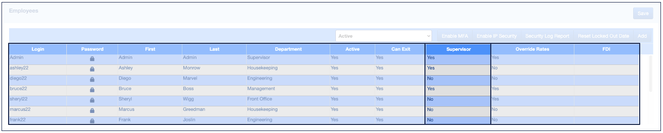 El nivel de supervisor se puede dar a cualquier persona y es parte de la configuración de usuario.Esta credencial no debe confundirse con el departamento de usuario como "Supervisor" o con los privilegios de acceso a "Front Office > Supervisor".