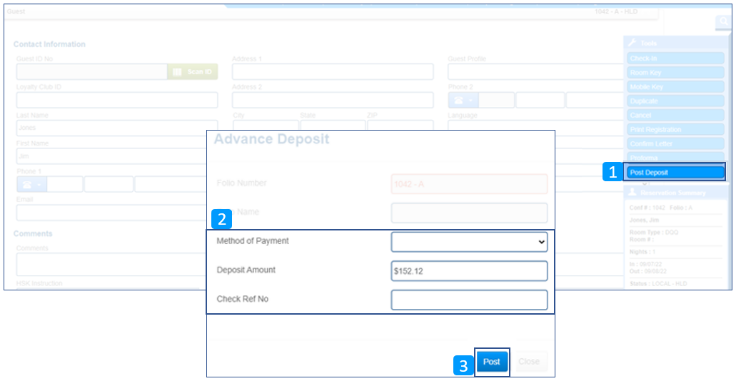 2. 2. 2. 2. Ventana de depósito anticipado - Introduzca el método de depósito de pago, cantidad y número de referencia de cheque.