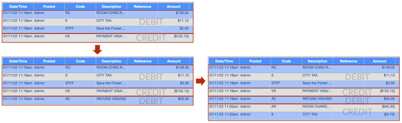 Un folio se compone de puestos de débito (cargo por habitación, impuestos, extras) y postes de crédito (pagos y ajustes) para poder cero.