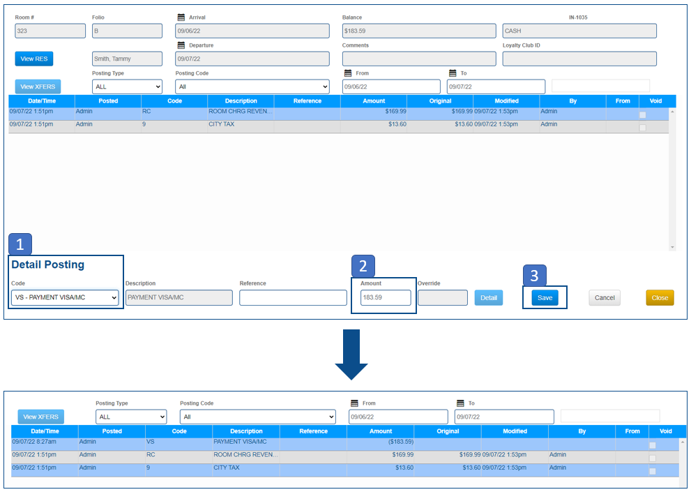 Camino:Front Office > Cajero > Cuenta de Invitado 1. 1. 1. Escriba el número de habitación de cada folio y la letra folio que desea transferir cargos entre los campos Sala # y Folio. Ambos folios pueden estar dentro del mismo número de habitación. 2. ...