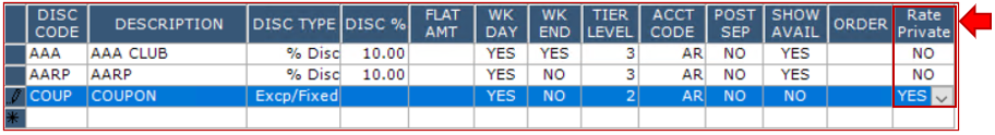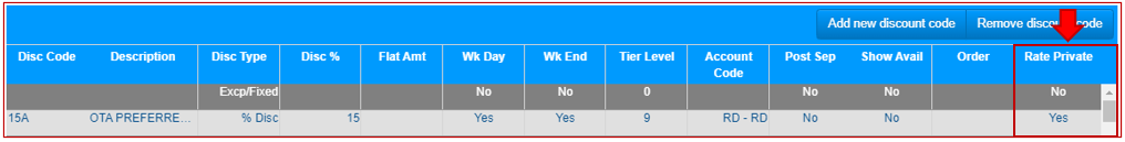 La configuración privada para un código de tarifa/descuento se encuentra en la configuración del código de descuento.