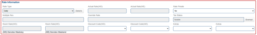 Estado fiscal:Ya sea que un invitado está exento del impuesto estatal o municipal. Haga clic en Exento para que la habitación de un huésped esté exenta de impuestos.