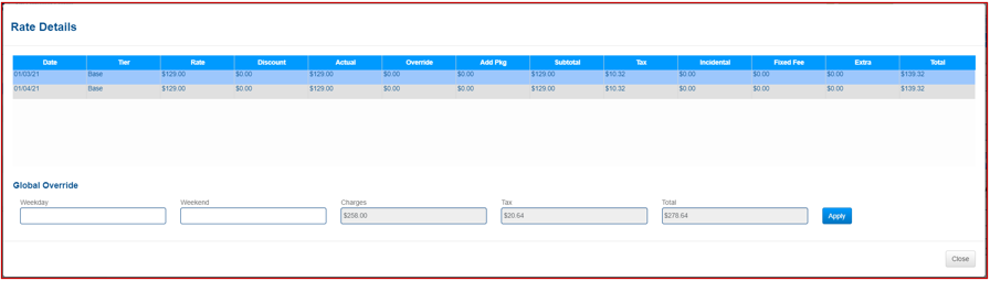 Tasa de anulación:Muestra la tasa de anulación establecida en la ventana Detalles de velocidad. Si hay una anulación diferente dependiendo de los días, solo se mostrará la anulación del primer día.