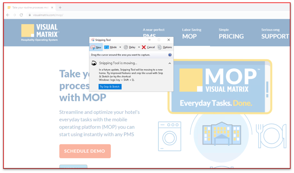 Snipping Tool es una utilidad de captura de pantalla de Microsoft Windows incluida en Windows Vista y posterior. Puede tomar capturas de pantalla fijas de una ventana abierta, áreas rectangulares, un área de forma libre o toda la pantalla. Los fragmentos se pueden anotar utilizando un ratón o una tableta, almacenados como un archivo de imagen o un archivo MHTML, o por correo electrónico.