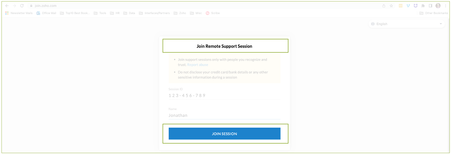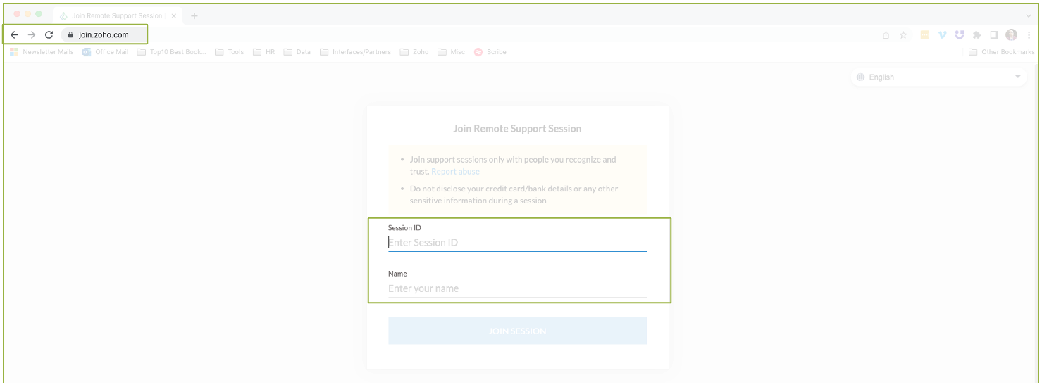 4. 4. 4. 4. Introduzca el ID de sesión de asistencia Zoho que le da el agente de experiencia del cliente.